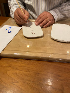 Use the pencil to draw the first 5 letters of the Aleph Bet on the first tablet, and the next five letters on the second tablet. You can trace the letters from this template: